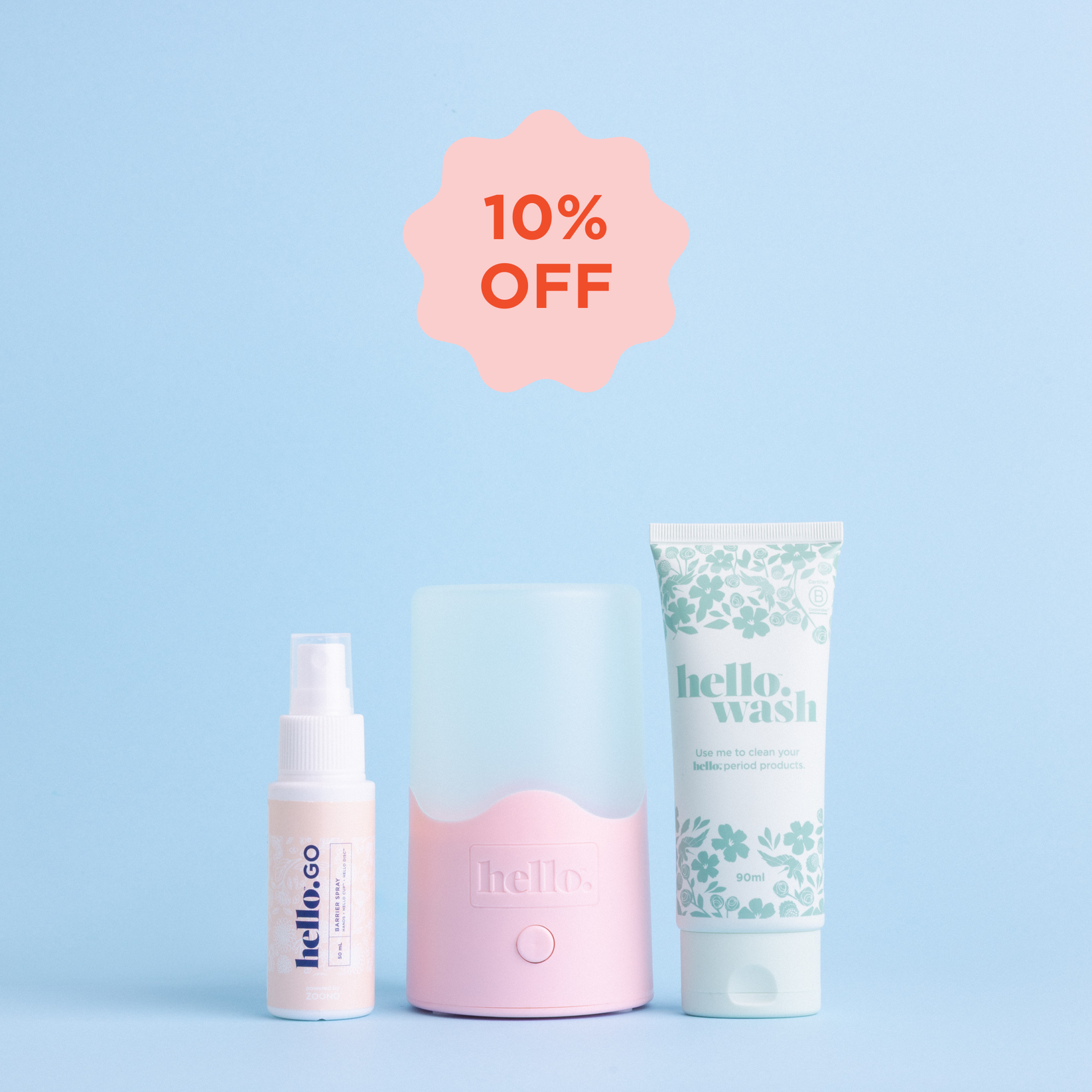 - Hello Go - a handy 'on the go' cleaning spray for both your menstrual disc and your hands.